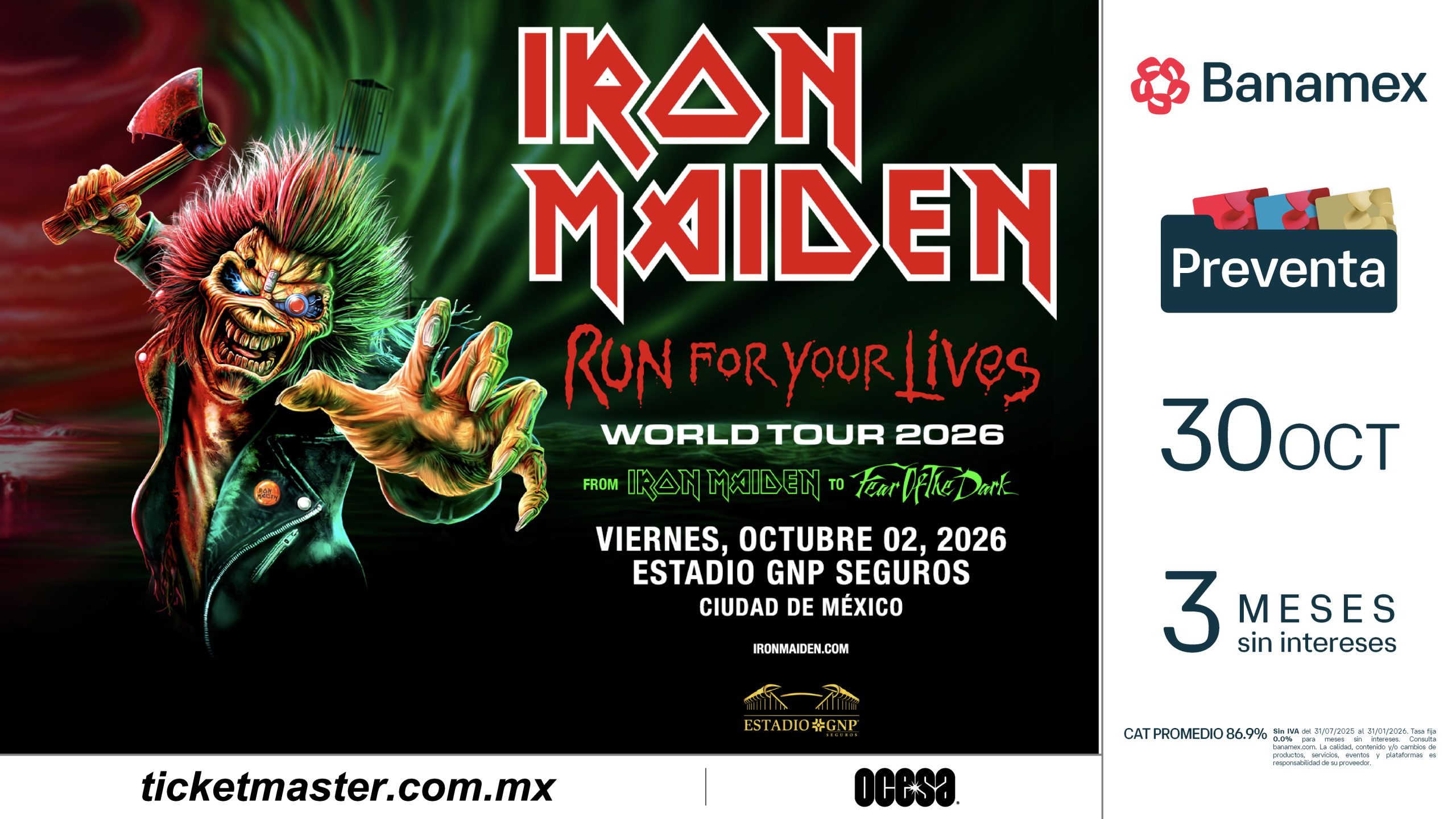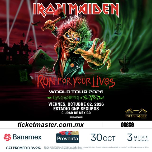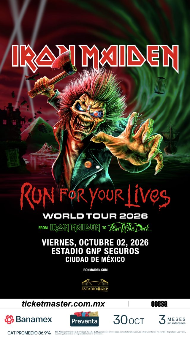 IRON MAIDEN anuncia hoy su tan esperado regreso a México con la aclamada gira RUN FOR YOUR LIVES WORLD TOUR. En celebración de su 50 aniversario, la banda se presentará una vez más en el magnífico Estadio GNP Seguros de la Ciudad de México, el viernes 2 de octubre de 2026, para ofrecer a los fans la oportunidad de disfrutar de una producción completamente nueva y de última generación, diseñada para grandes escenarios al aire libre, acompañada de un repertorio único con canciones de sus nueve primeros y revolucionarios álbumes.