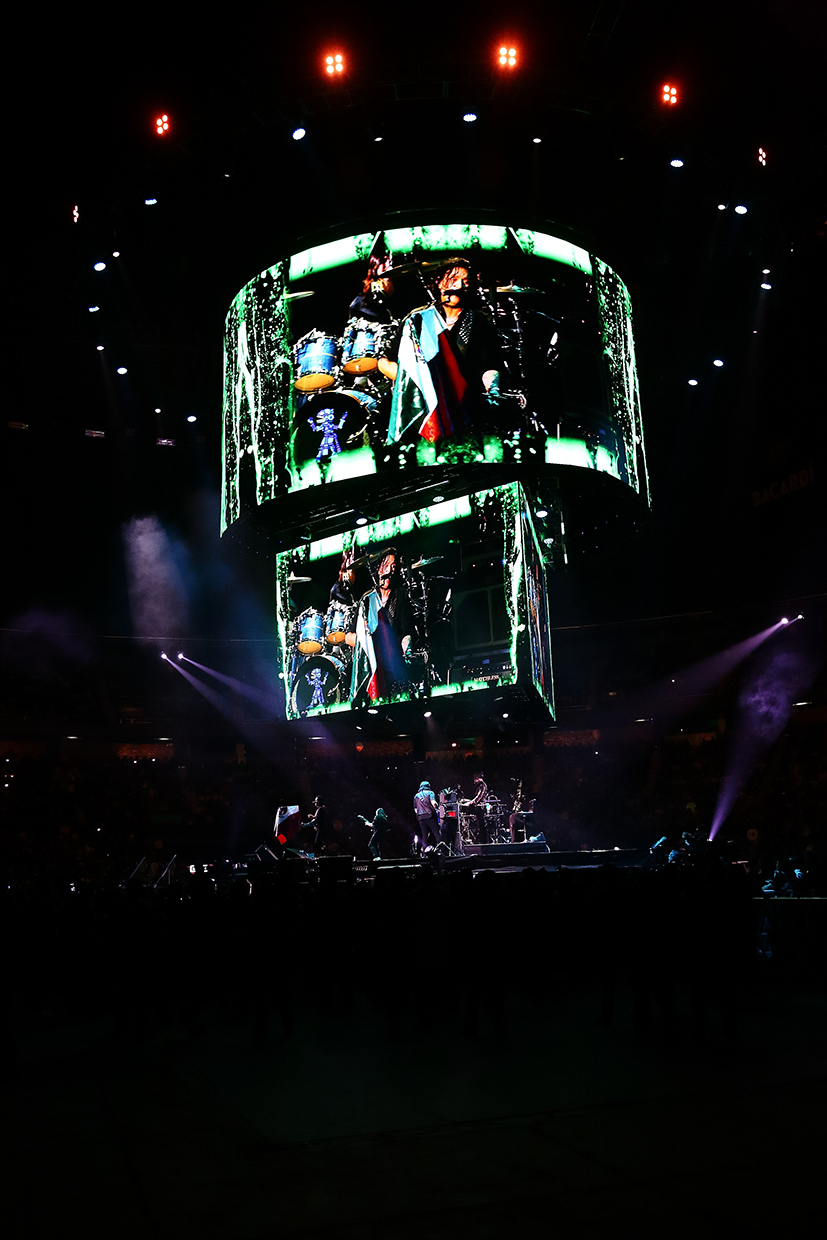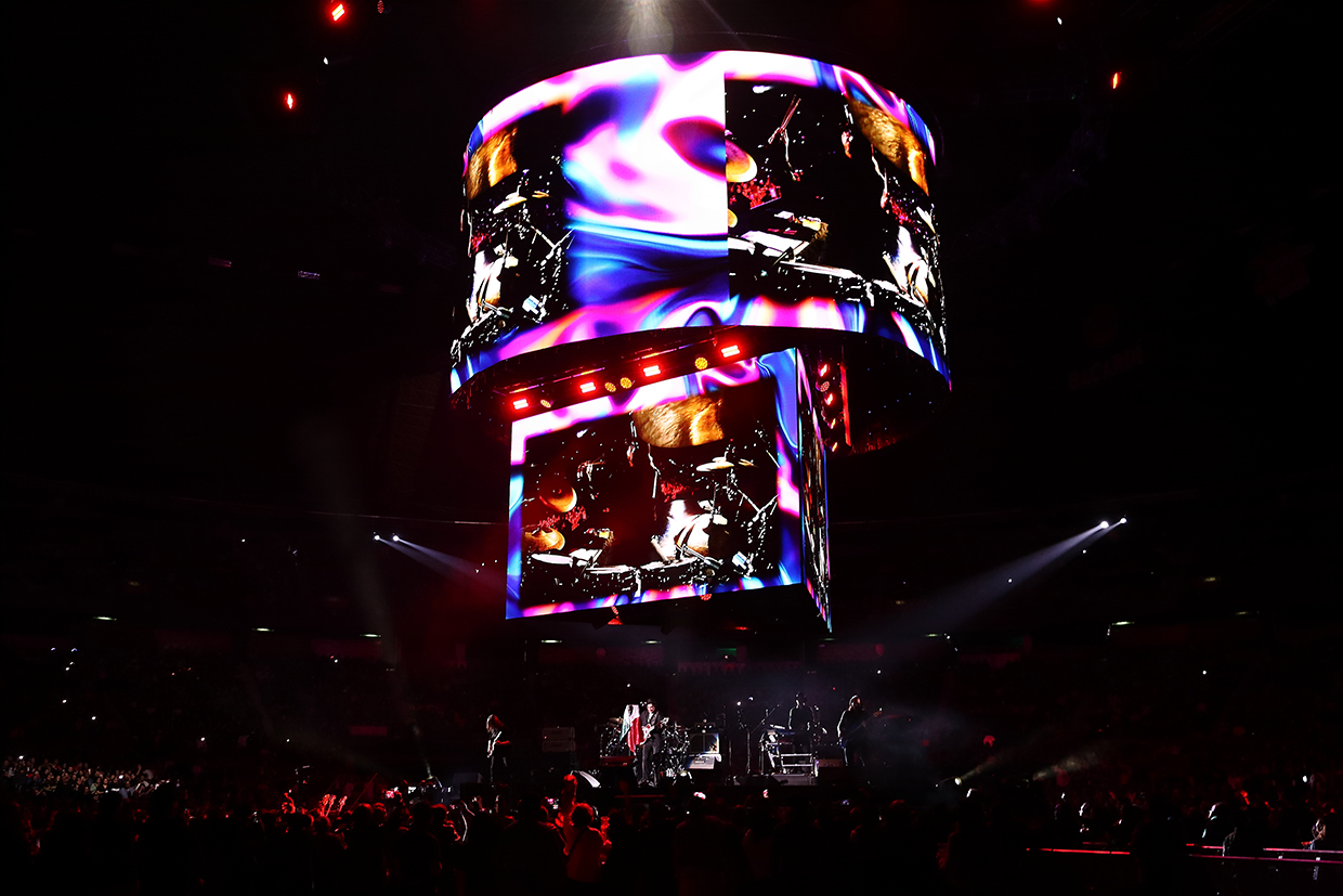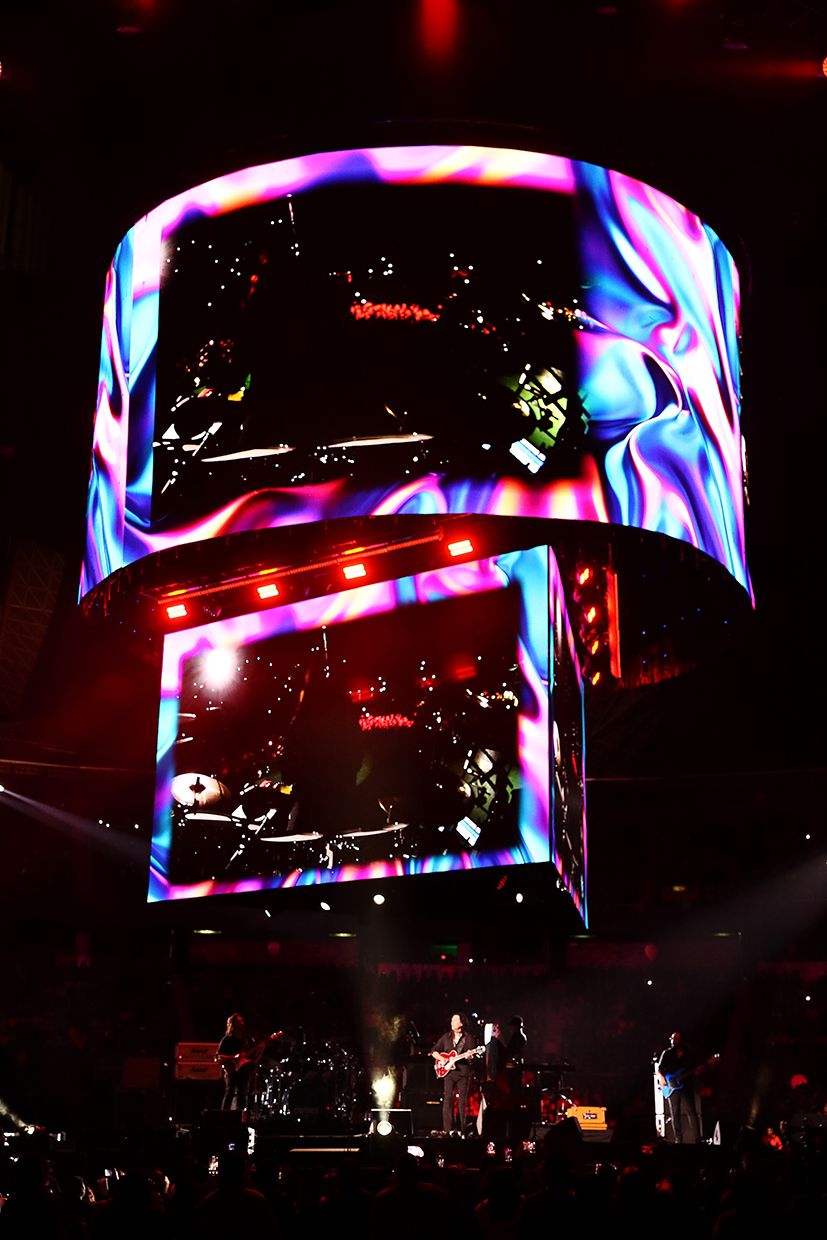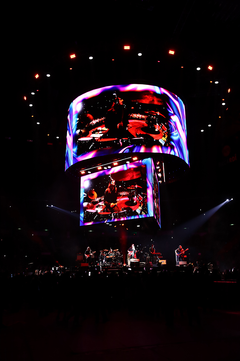 Así, con show renovado y un sonido harto fino la columna circular, montada en el cenit del espectacular techo metálico, de donde colgaban pantallotas leds gigantes, de arriba hacia abajo circular, sobre un triángulo también gigantesco, donde se transmitieron detalles que ocurrían tanto arriba como abajo del escenario también circular, lo que permitió contextualizar las emociones con una vista esférica espectacular, logrando el efecto envolvente tanto por las imágenes del video en directo como el sonido ¡que bruto!, ¡qué chulada!, fue completamente envolvente y decir eso en un foro techado es decir mucho, y ni hablar de la iluminación que tanto la estroboscópica como la de tonos rojizos, daba cierto vértigo al viejito que les saluda mientras vuelve a disfrutar en espera de que el café le haga efecto: “Aquí No Es Así”, “Para Que No Digas”, “Detrás De Ti”, “Detrás De Los Cerros”, “Miedo”, “Miércoles de Ceniza”, “Viaje Astral”, “Nada”, “Los Dioses Ocultos”.