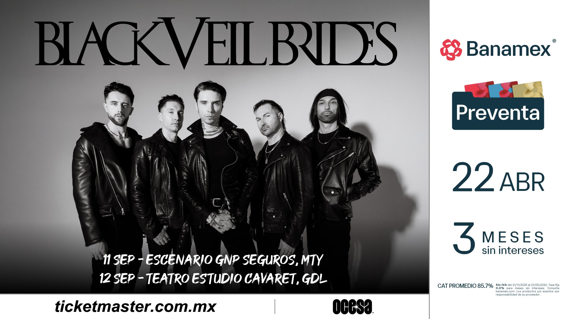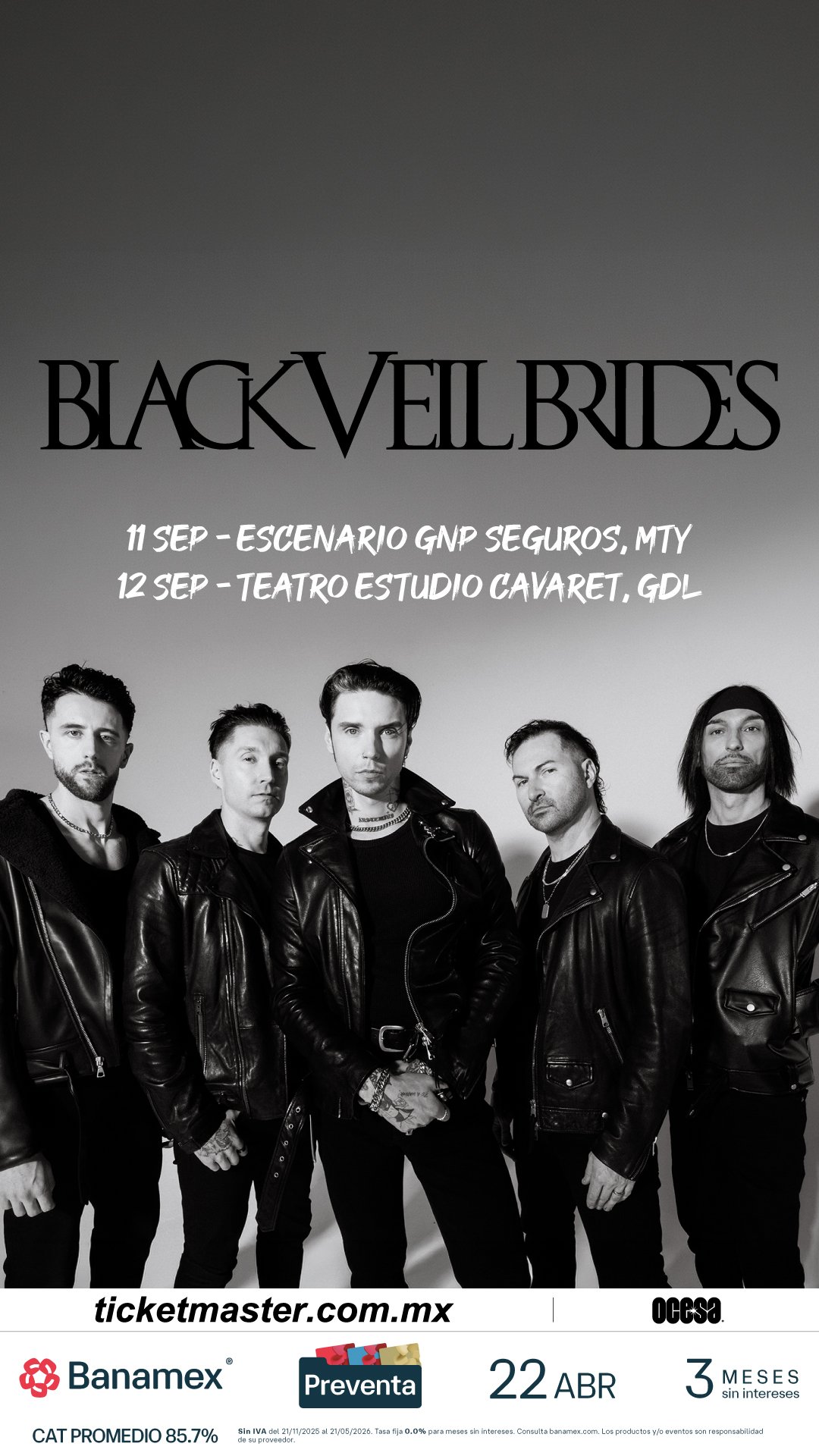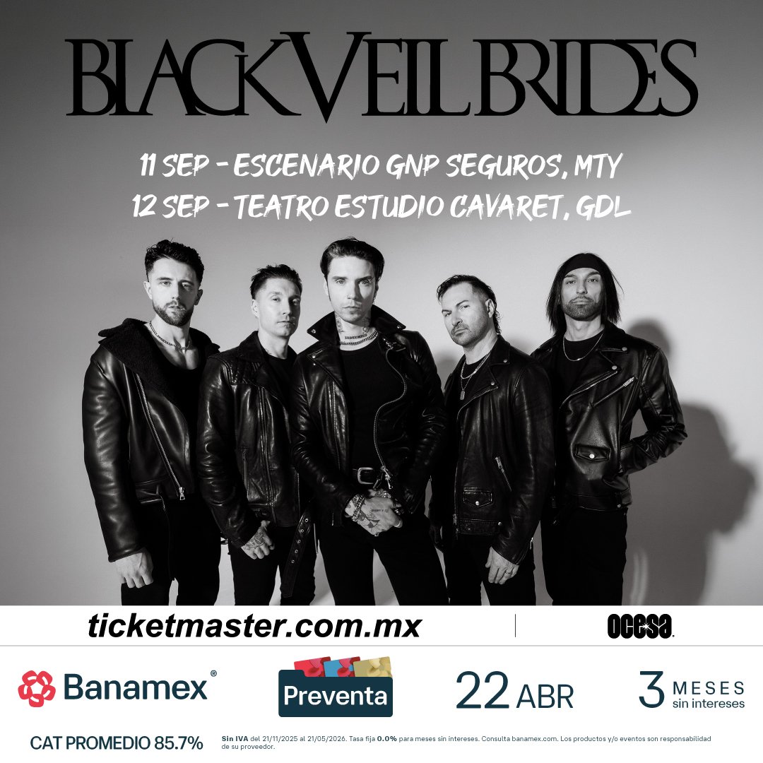 Fieles a una expresión artística sin concesiones y con una base profundamente arraigada en la tradición del hard rock y la iconoclasia que rompe las reglas, Black Veil Brides anuncia su regreso a México como parte de la nueva era creativa que acompaña el lanzamiento de su próximo álbum de estudio, Vindicate, disponible a partir del 8 de mayo. El grupo liderado por Andy Biersack pisará el Escenario GNP Seguros el próximo 11 de septiembre en Monterrey y un día después, el 12 de septiembre, el Teatro Estudio Cavaret en Guadalajara.