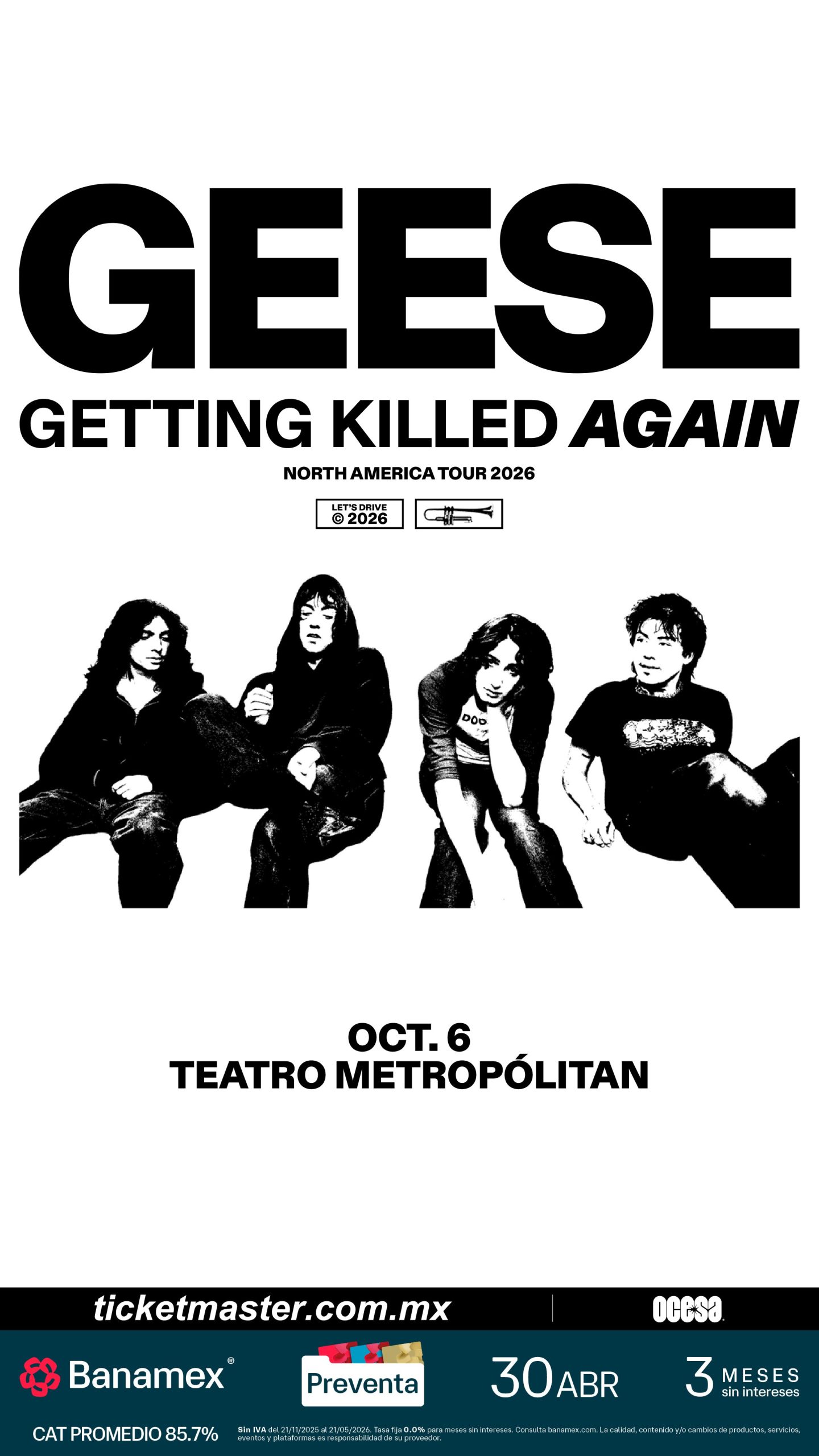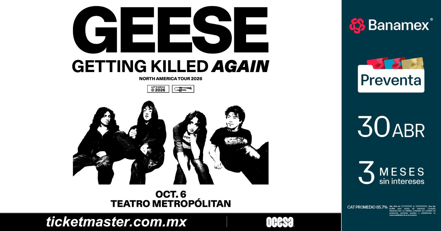 La banda de rock estadounidense, Geese, anuncia su gira por Norteamérica en este 2026, Getting Killed Again. Iniciando el 29 de septiembre en Nashville, esta nueva etapa por el continente los llevará a tocar en recintos aún más grandes durante el otoño, incluyendo el show como headliner más grande de su carrera hasta la fecha: un concierto en casa en el Forest Hills Stadium de Queens el 2 de octubre. Su presentación en Ciudad de México tendrá lugar el próximo 6 de octubre en el emblemático Teatro Metropólitan.