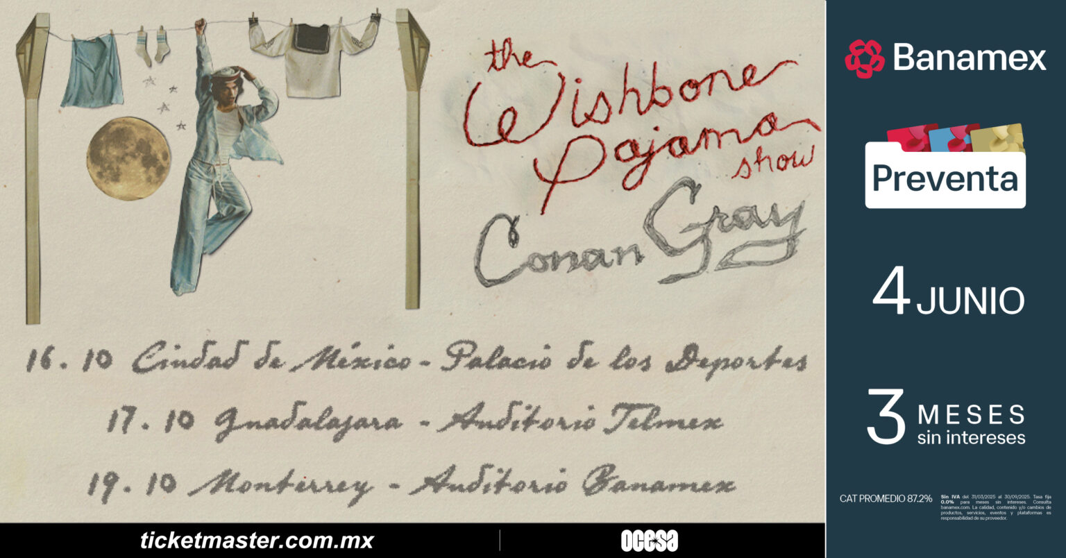Los fans pueden registrarse para la preventa de artistas desde ahora hasta el 1 de junio a las 10 PM PT en conangray.lnk.to/tour. La preventa Banamex para las fechas en México será el 4 de junio. La venta general comenzará el 5 de junio a las 10 A.M. hora local. ¡Conan interpretará por primera vez en el escenario música de su muy esperado próximo álbum Wishbone, es un show que no querrás perderte!