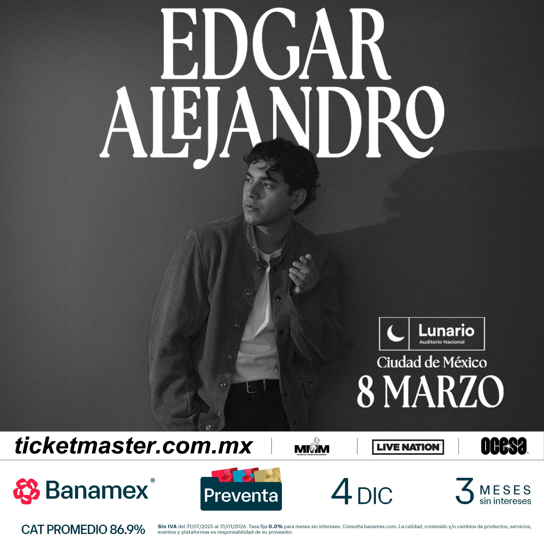 La llegada de Edgar Alejandro al Lunario representa un momento clave en su carrera: su primer encuentro en vivo con su público mexicano y el inicio de una nueva etapa que promete consolidarlo como uno de los artistas más relevantes de la escena actual. Asegura tus boletos en la Preventa Banamex el 4 de diciembre o en la Venta General a partir del 5 de diciembre, disponibles en Ticketmaster y en la taquilla del Lunario.