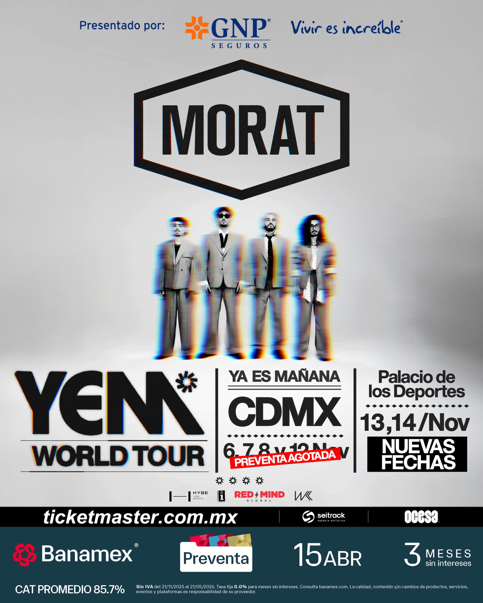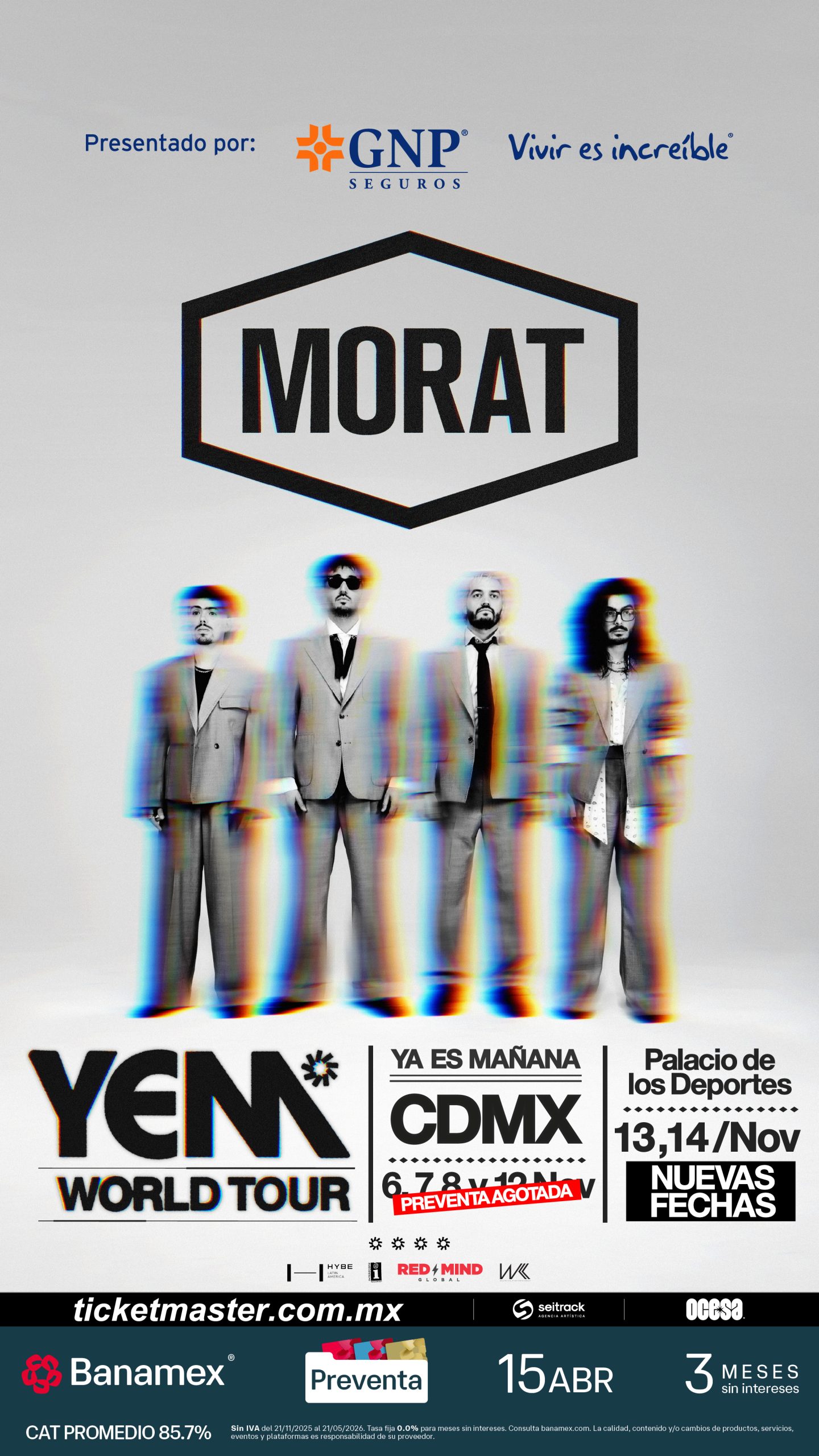Gracias al éxito del YEM World Tour en México, la banda colombiana confirma que el entusiasmo del público capitalino ha sido tan abrumador que se suman dos nuevas fechas a las cuatro previamente anunciadas en Palacio de los Deportes. También, tendrá lugar una noche más para Monterrey y Guadalajara, consolidando una gira imparable que transforma cada show en una auténtica celebración de su trayectoria y el vínculo único que Morat mantiene con sus fans mexicanos.
