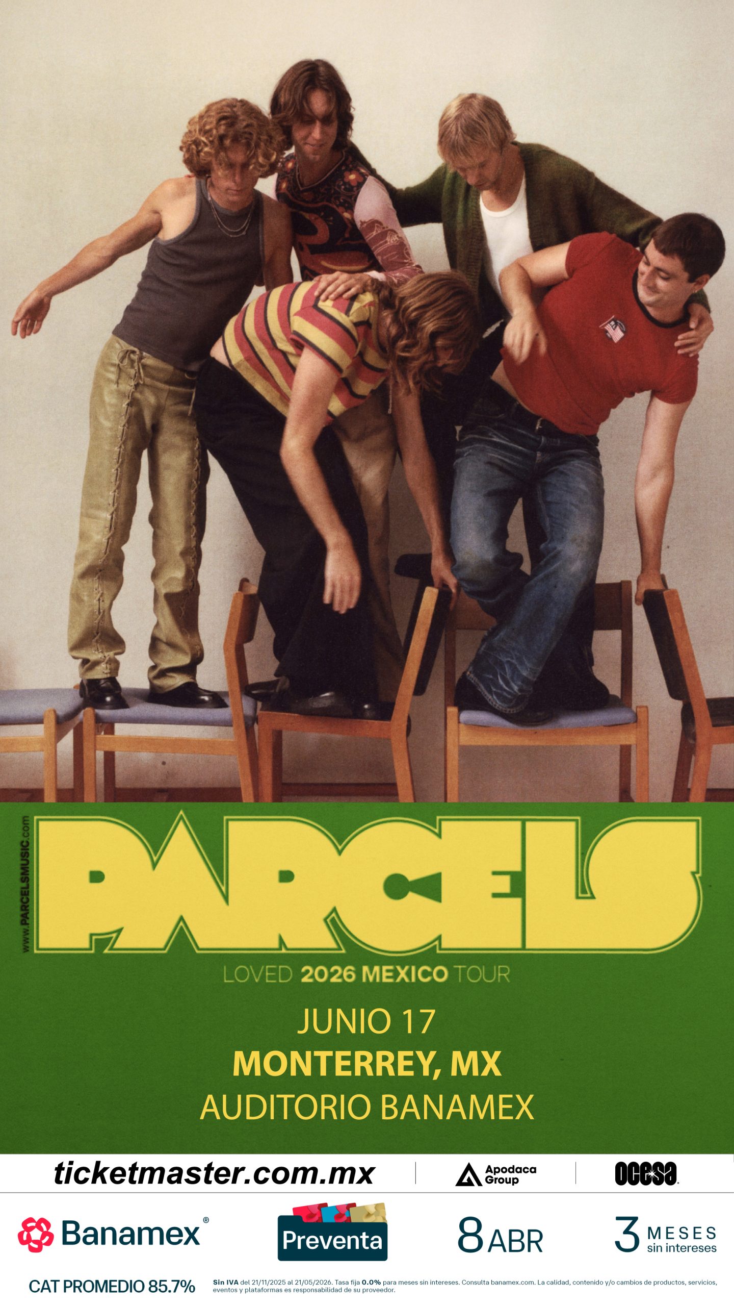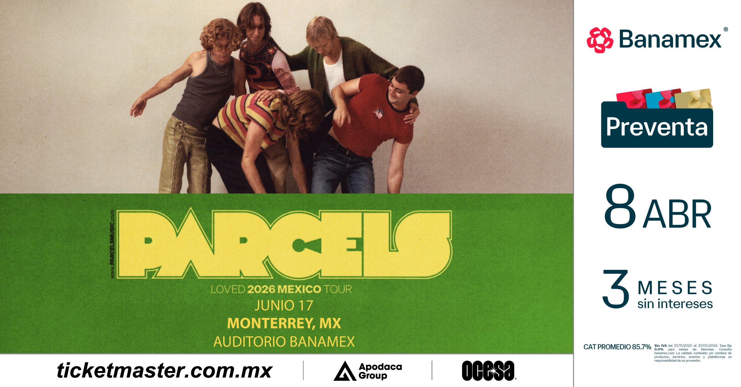 Asegura tus boletos durante la Preventa Banamex el 8 de abril o bien, en la venta general que se liberará el 10 de abril a través de Ticketmaster o en las taquillas del inmueble. La Venta Fans tendrá lugar el 8 de abril, para más información, visita: https://www.parcelsmusic.com/live